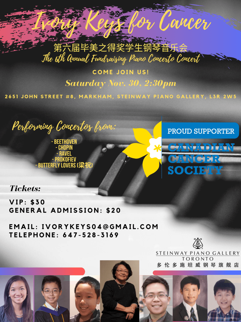 Our 6th Ivory Keys for Cancer Concert will be held on Saturday Nov 30th at 2:30 pm. Come join us to celebrate the beauty of piano music and support Canadian Cancer Society!